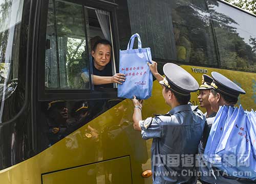 在228省道公路卡口,运政人员将装有毛巾、矿泉水等用品的“清凉包”送到开车经过的客车、出租车等驾驶员手中,对驾驶员在高温下长时间辛苦工作表示亲切慰问,并叮嘱他们注意开车安全。
