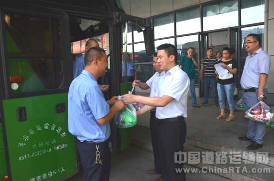 7月28日上午,淮安红日交通投资发展总公司总经理羊兆宏、工会主席陈士超带领总公司领导班子,开展为一线驾驶从业人员高温送清凉活动,为驾驶从业人员送去饮料、毛巾、风油精等防暑降温品。在现场,羊兆宏总经理叮嘱大家:要认真做好防暑降温工作,合理安排休息时间,切实保障身心健康,防止疲劳驾驶;要严守操作规程,坚决杜绝人身伤害和车辆安全事故发生。希望大家不管在多么恶劣工作环境下都能把好手中的方向盘,遵守驾驶操作规程,开好安全车,才能更好的为全县的人民群众出行做好安全运输服务。