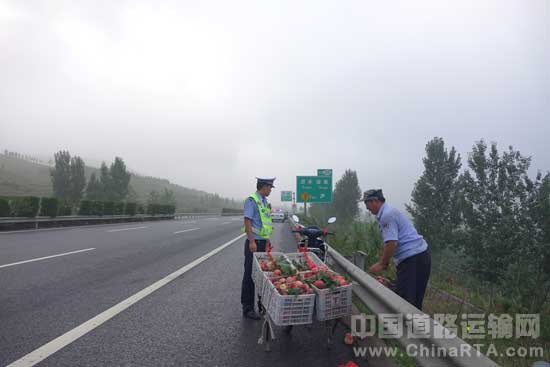 近日高速交警沂源大队民警在巡逻过程中发现在路边应急车道内停放着一辆助力摩托车,旁边一辆手推车车上装满了鲜桃,民警立即下车查看,发现在护栏外面一家人正热火朝天的采摘桃子,经过询问民警得知,该桃园的主人是附近服务区的工作人员,由于下雨道路泥泞不好走,这里离服务区近,所以才想出来穿过高速公路防护网,借道高速路把采摘的桃子直接运到附近服务区,根据《山东省高速公路交通安全条例》相关规定行人、非机动车、摩托车禁止进入高速公路。民警对当事人进行了安全宣传教育,当事人也认识到了自己的行为所造成的安全隐患,立即进行了整改。