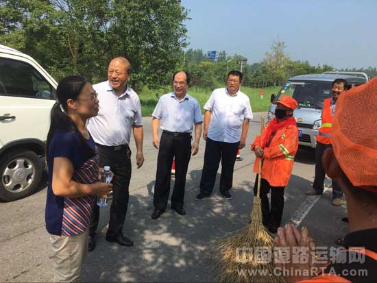 7月26日上午,连云港市交通运输局副局长蔺宁君一行在东海县交通运输局长朱迟彦等陪同下,到323省道和机场路养护现场,为一线公路养护工人 “送清凉、送安全、送法律”。