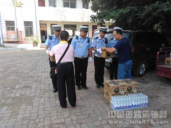7月28日下午19时,个体经营户张先生在不耽误交警上班执勤,来到交警大队潼洛中队,将12箱饮用水送到一线交警手中,为交警们送来了一份夏日的清凉和真切的关怀。