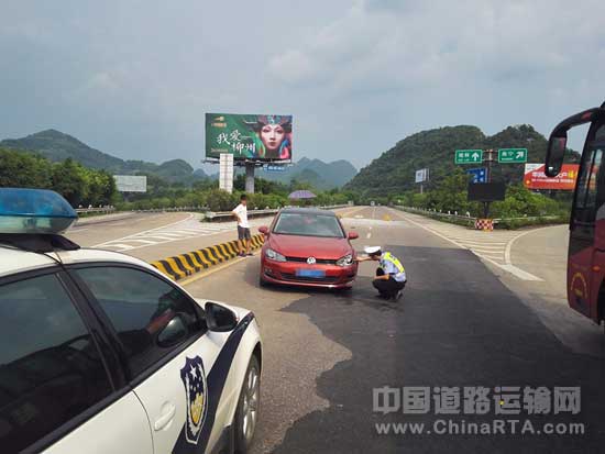 据广西高速交警二大队民警介绍,当时他们正在柳州收费站执勤,看到一辆红色小轿车突然失控冲破隔离墩,停在了对向车道上,他们立即赶往事故现场进行处置。