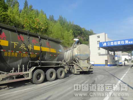 2016.8.13中午13时房县流动治超执法人员在G346国道巡查中发现一罐式货车涉嫌超限运输。不论如何宣传教育,驾驶员拒不接受到固定站接受处理,执法人员当即联系当地交警中队。交警赶到后暂扣其相关证件并联系施救中心将车开至房县高枧超限站。经检测,该车车货总重85.3吨,超限55%。见此形势,驾驶员转变态度,联系车辆对超限货物进行了转运,并交纳了818元路产补偿金和2000元罚款。