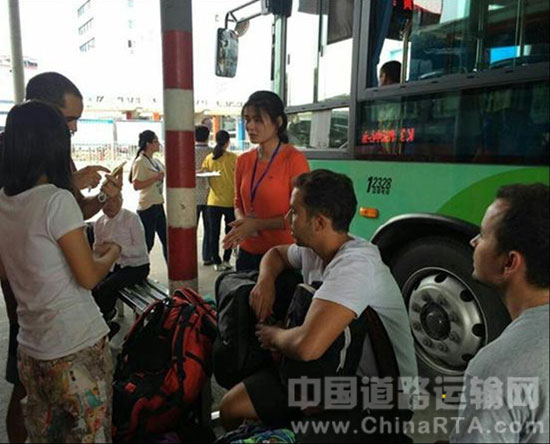 9月18日下午,三位外国友人在浦江县汽运中心一筹莫展,汽运中心工作人员姚苏莉、金焦龙、黄晶晶、黄婷婷等闻讯上前帮助。经过简短对话交流,方知他们来自西班牙,刚从杭州到浦江,想去登高村游玩,因为不会中文也不认识路而犯愁。工作人员建议他们坐出租车可直达目的地,但三位外国友人说想乘坐公交车看看沿途风景。工作人员引导他们坐城市公交3路车到石宕村,嘱咐司机到站后提醒外国友人下车,并用中文把目的地写在纸上,方便他们继续问路。