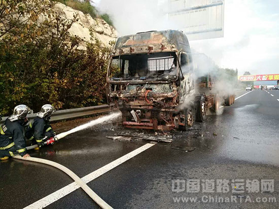 10月11日下午,沂源高速交警在青兰高速沂源东收费站附近巡逻时,发现应急车道内浓烟滚滚,熊熊大火将一辆重型半挂牵引车烧得面目全非,甚至蔓延到了路旁的草木,而驾驶员在路旁手足无措,焦急万分。形势危急,民警立即联系消防、路政、清障部门赶到现场,同时指挥路面车辆,疏导交通。经过30分钟的联合救援,成功地扑灭了燃火,消除了安全隐患,避免了次生事故和交通堵塞的发生。