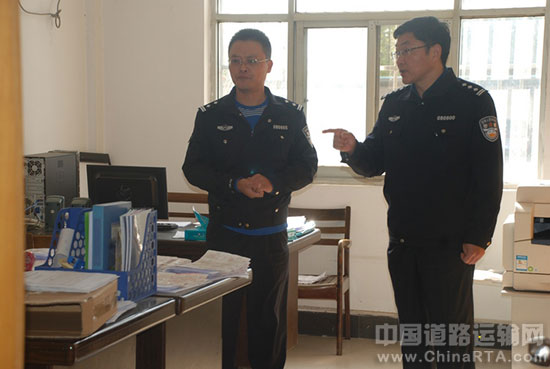 11月1日,淮安交警支队副支队长王正宇在后勤装备大队大队长葛树森的陪同下,到高速一大队检查指导工作。