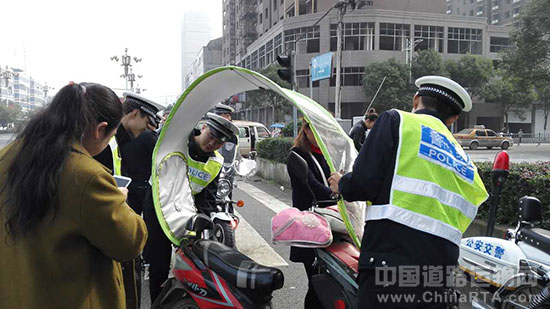11月16日上午,大队结合辖区实际,组织警力利用上下班高峰期做为重点查纠的时段,并在流量大的广场西路、汽车站路口等摩托车和电动车行驶相对集中的地区和路段,采取流动巡查纠违和固定岗点检查的方式,对摩托车和电动车加装遮阳伞违法行为进行整治,做到逢违必究,对私装“遮阳伞”的一律强制拆除伞具。同时,交警及时查纠处罚电动车、摩托车不戴头盔、逆向行驶,小车司机不系安全带等交通违法行为,有力净化了辖区道路交通环境。