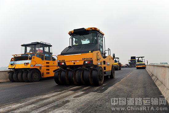 在该项目S1标沙溪信江大桥施工现场,笔者看到一辆辆载满沥青砼的运输车辆来回穿梭,大型摊铺机将灼热的沥青砼缓缓铺到桥面,3台双钢轮压路机、2台胶轮压路机尾随其后往来碾压,整个工地马达轰鸣,机声阵阵,热火朝天。
