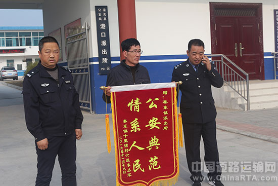 11月18日上午,潼关县秦东镇十里铺六组被救助村民李丛军康复出院后,为感谢港口派出所领导及民警火速出警救助、及时挽救生命,专程送来一面“公安典范 情系人民”锦旗。