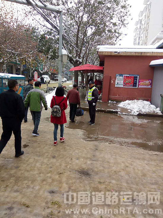 11月23日,潼关交警大队车管所民警在县城育贤路东口顶风冒雪,依然坚守高峰岗,开展文明交通劝导,疏导交通秩序。