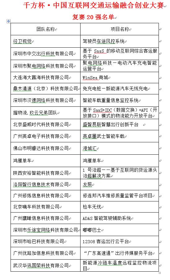千方杯·互联网交通运输融合创业大赛全国20强