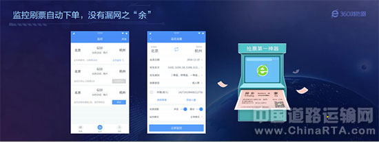 360浏览器具备全自动刷票功能。当用户选择车次(可多选)、席座(可多选),指定出发日期后,360浏览器可以自动帮用户监控余票情况,一旦有票,会自动帮用户提交订单,然后提示用户支付。抢票提醒也是手机浏览器的重要功能。用户可以提前输入自己想要购买的车票、车次及日期,抢票当天会提前收到短信提醒。