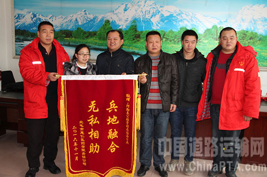 12月8日,北屯市惠仁医药有限责任公司经理一行来到阿勒泰公路管理局福海分局,将一面写有“兵地融合 无私相助”的锦旗送到了福海分局副局长手中,感谢分局养护职工及时救助公司受伤职工。