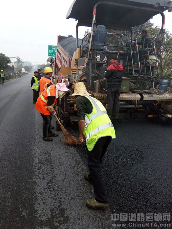 该工程2016年9月18日开工,全长9.449公里,建设标准为二级公路,路基宽9.3m,路面宽9m,采用20cm厚就地冷再生水泥稳定碎石下基层+18cm厚厂拌水泥稳定碎石上基层+6cm厚沥青砼下油面层+4cm厚沥青砼上油面层。油面摊铺开工以来,遇到长时间连续降雨,工期受影响。为抢抓施工进度,永丰公路分局加强现场监管,科学合理组织施工,施工人员放弃休息时间,加班加点进行施工,所有人员凌晨6点开始动工,晚上9点收工,确保了整个工程如期按质按量顺利完工。