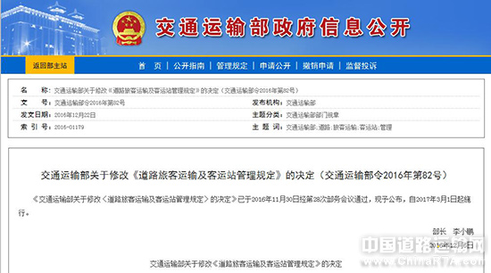《交通运输部关于修改〈道路旅客运输及客运站管理规定〉的决定》已于2016年11月30日经第28次部务会议通过,现予公布,自2017年3月1日起施行。