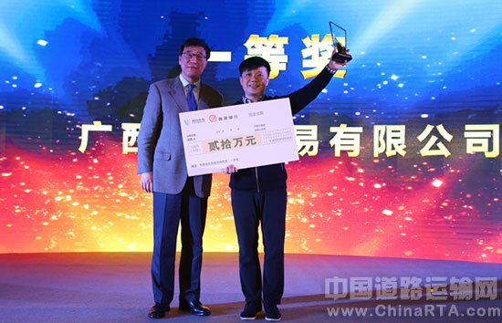 图为联合卡车董事长李胤辉先生为年度突出贡献奖获得者“广西翔森贸易有限公司”颁奖