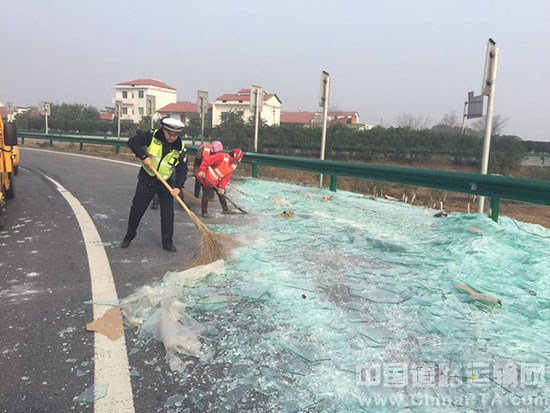 由于26吨玻璃无一完好,全部洒落在匝道上,致使车辆无法正常通行,高速交警一支队四大队民警赶到现场进行指挥疏导,对下高速匝道进行了临时交通管制,并在后方提醒下高速车辆绕行事发地,与应急养护所工作人员一同进行清扫,及时避免了车辆的拥堵和二次事故的发生。