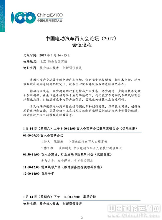 为进一步促进跨领域、跨产业、跨学科交流,推动形成有利于电动汽车发展的产业生态,中国电动汽车百人会定于2017年1月14日-15日在北京钓鱼台国宾馆召开“中国电动汽车百人会论坛(2017)”。