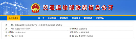 (十三)实现行业信息共享。依托国家交通运输物流公共信息平台、电子口岸公共平台等现有信息管理系统建立多式联运公共信息资源平台,提供资质资格、认证认可、检验检疫、通关查验、税收征缴、违法违章、信用评价、政策动态等一站式服务。积极引导企业开放枢纽站场、运力调配、班线计划等数据资源。(国家发展改革委、交通运输部会同工业和信息化部、商务部、海关总署、质检总局、税务总局、铁路局、民航局、邮政局、铁路总公司等负责)