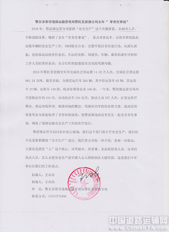 [内蒙古]鄂尔多斯市道路运输管理局鄂托克前旗分局全年“ 零责任事故”
