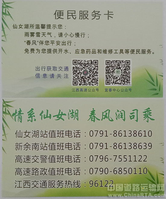 “便民服务卡”是仙女湖管理所针对春运期间车流量增大及司乘人员询问常用信息而精心制作的,目的是为了方便过往司乘,切实为司乘排忧解难、解决燃眉之急。 “便民服务卡”内容主要包括:恶劣天气温馨提示和服务承诺、所辖收费站24小时值班电话、高速交警、高速路政值班电话等。卡上还印制了获取交通信息的“江西高速”和“宜春中心”公众号二维码,方便出行的司乘人员通过公众号能够提早得知路况信息。