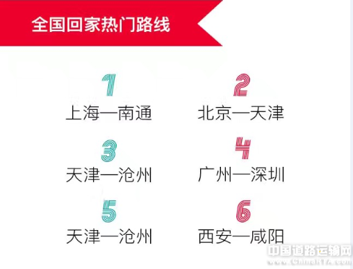 返乡热门路线为上海—南通、上海—苏州、北京—天津、北京—保定、天津—沧州、天津—廊坊、广州—梅州、深圳—邵阳、西安—咸阳、西安—渭南。