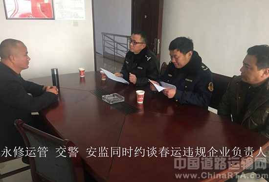 笔者获悉,2017年1月26日下午16时30分,九江市道路运输管理局永修分局、永修县公安交警大队、永修县安监局三家联合约谈春运期间违规经营客运企业负责人。