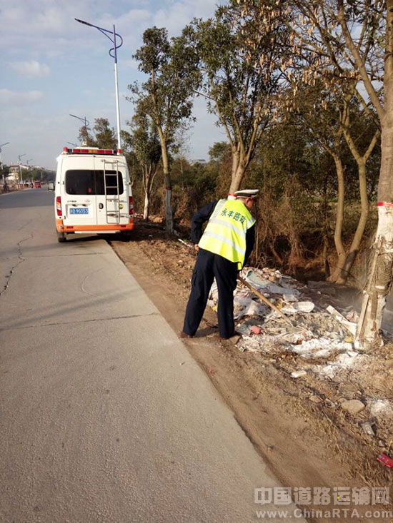 大年初二上午,永丰公路分局路政人员在春节值班巡查中发现,在S318线k280+130m处有偷倒的广告垃圾堆放在路肩上,既影响公路路容路貌,又严重妨碍了公路通行的安全,存在一定程度的安全隐患。路政人员及时予以清理,确保春运期间道路的安全与通畅。