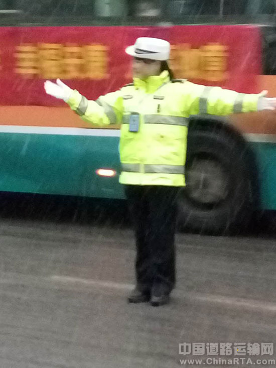 在万所长的细心指导下,车管所年龄最小、最腼腆的90后女警韩蕾早已经可以独自熟练指挥过往车辆,不怕苦,不怕累,已经养成工作习惯。在风雪中,她依然坚守高峰岗阵地,用手势不间断指挥过往车辆与行人,展现出车管所女警的飒爽英姿。
