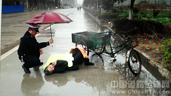 当日14时30分许,市交警直属二大队事故中队民警正在路面执勤巡逻,就听见群众说在前面玉茗路延伸路段有个老人跌倒在地上。中队民警曾文祥等人一听,便立即驱车赶至现场,到达现场后,民警只见其躺在全是水的路上,全身湿透,一旁的山轮自行车侧翻在地。询问中,民警还发现老人口齿不清,意识模糊,口中喃喃说不出个所以然,从其呼气中还透出阵阵浓烈的酒气。根据工作经验,现场并无与其他车辆及物体碰撞痕迹,民警怀疑老人是喝酒喝醉了,骑车不慎才跌倒的。考虑到地面冰凉,担心老人受凉,民警曾文祥立即将老人扶起,还脱下自己的警用雨衣盖在老人身上,协警吴文灏便蹲下来为老人撑伞挡风,同时立即拨打了110和120,此时的交警已经成了“浇警”。