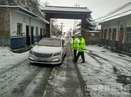 2017年2月8号15时,路面结冰,雪量增大,潼关矿区交警中队民警加强对桐峪上山路口检查工作。