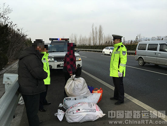 14时许,民警巡逻中发现前方应急车道内“躺了”三四个麻袋,正停车查看,发现对面有两位中年人在横穿高速公路,此时路上车流较大,民警开启警笛警示,两人来到车旁解释道:两人为附近村民,外出打工,为图方便就到高速公路上等车。民警耐心解释并告知两人:“行人上高速公路不但违法,也很危险,如果发生交通事故后果不堪设想还要承担一定的法律责任。而且在高速公路上,客运车辆违规停车上下客将被处以记12分的处罚,所以你们在这里是等不到车的。” 两人保证不再上高速等车,主动离开了高速公路。
