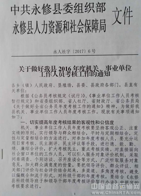 按照“中共永修县委组织部 永修县人力资源和社会保障局” 《关于做好我县2016年度机关、事业单位工作人员考核工作的通知》(永人社字〔2017〕6号)要求,依据《公务员考核规定(试行)》、《事业单位工作人员考核暂行规定》和省委组织部、省人社厅、省财政厅、省公务员局《关于做好全省公务员年度考核工作的通知》精神,为了做好永修县机关、事业单位工作人员年度考核工作,九江市道路运输管理局永修分局全力支持、投入到目标考核工作中,并荣获2016年度目标考核先进个人名额一人。