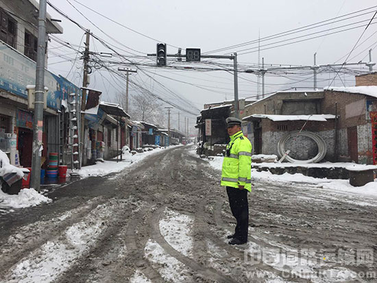 2月21日,潼关城乡普降大雪。矿区交警中队及时调整勤务安排,全体民警提前上路,风雪开展交通疏导工作。