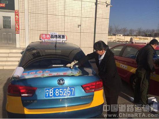 为提高全民“创建国家卫生城市”意识,惠农区运管科运用好出租车这个宣传载体,将创卫广告语粘贴到出租车上,拍照留档,并告知司机担负起宣传任务,让创卫意识蔚然成风。