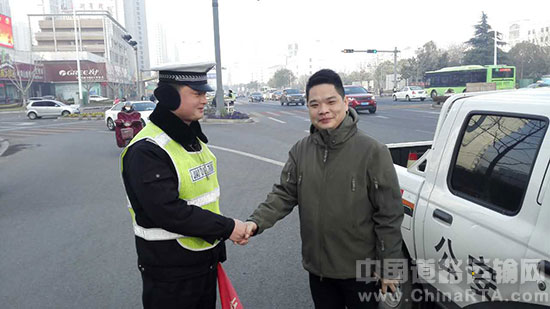 2月23日早高峰,在深圳路与南昌路口,当失主陈某拿到丢失的钱包时,紧紧握住江苏淮安市交警三大队二中队辅警刘锦华的手,连声表示感谢。