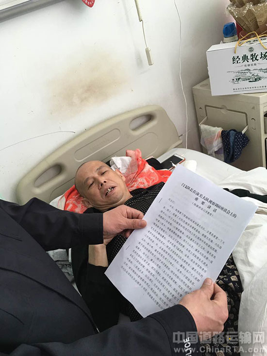 张朝明因患胆结石住进渭南市中心医院,在车管所担任考试员,主要负责准驾驶人科目一及安全文明理论考核。车管所领导利用看望张朝明之机,在病床前,向张朝明传达市支队及大队2017年车驾管工作思路、工作措施和工作要求。张朝明同志当即表示:自己要积极配合医生治疗,力争早日康复,重返工作岗位,为潼关县车驾管做出积极贡献。