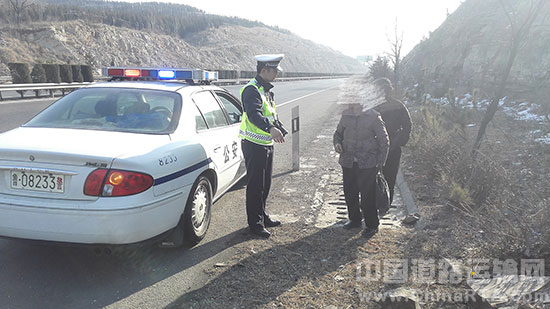 2月28日上午,沂源高速交警巡逻途中发现有两位老太太竟然互相搀扶着在高速公路应急车道内行走,情势十分危险。民警立即上前询问,得知两位老人是附近的村民,两人是亲姐妹,并且都已经年过八旬。他们要去两公里外的亲戚家,为图省事,竟然穿过护栏外的铁丝网走上了高速公路。为保证安全,民警依法对其批评教育后将两位老人护送下高速公路。