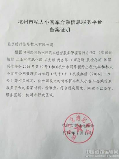 嘀嗒拼车成为全国首家获得政府备案的合乘平台