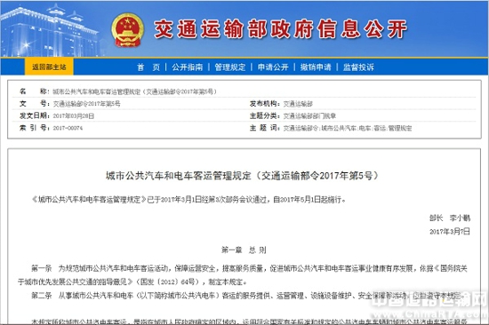 近日,交通运输部以2017年第5号令在其官网正式发布了《城市公共汽车和电车客运管理规定》》(以下简称《规定》),《规定》自下月起实施。