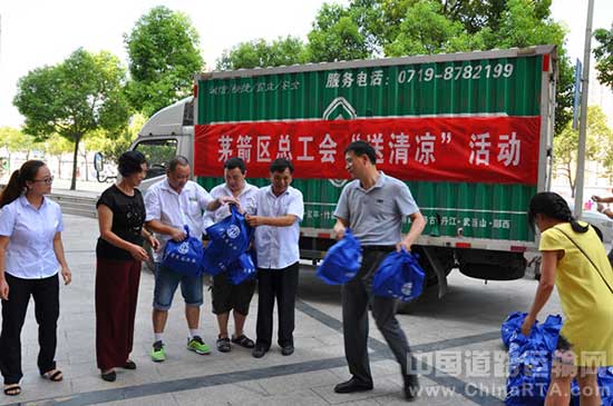 7月21日上午,茅箭区总工会常务副主席姚忠铭带领“送清凉”车队莅临顺强公司,将50份降温物资发放给顺强公司员工,公司董事长刘翠兰对茅箭区工会的关爱致谢。