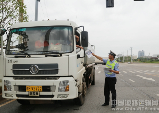 针对辖区交通实际,各片区民警根据危化品运输车辆违法行为发生的规律、特点,在抚八线沿线设卡布点,逐一对过往的危化品运输车辆进行登记检查,重点检查危化品运输车辆行驶的时间、路线、准运证、驾驶人资质、车辆安全状况、是否加装紧急切断装置、是否超载、是否办理押运证等情况,逐一登记检查情况,完善重点车辆管理档案。检查中,中队民警还向过往危化品运输车辆发放了交通安全常识宣传材料,希望通过宣传教育提高驾驶人的交通安全意识,预防和减少危化品运输车辆交通违法行为的发生。