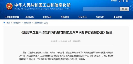 9月28日,工信部网站正式发布《乘用车企业平均燃料消耗量与新能源汽车积分并行管理办法》(工业和信息化部 财政部 商务部 海关总署 质检总局令第44号,下称《办法》),业内讨论许久的“双积分”政策靴子终于落地。为了更好地理解和执行《办法》,工业和信息化部政策法规司负责同志对《办法》进行了解读。