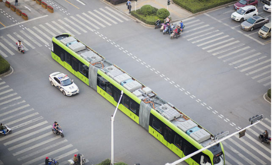 10月23日,在有着“中国电力机车之都”美誉的湖南株洲市中心,由中国中车株洲电力机车研究所自主研发的全球首列智轨列车正式上路,运行在3公里长的体验线上。长31.64米、宽2.65米的车身,沿着画在地上的“轨道”,规矩地行驶。