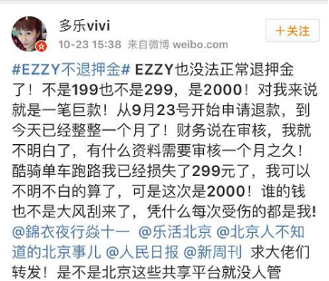 EZZY的平台押金高达2000元,目前,不少人发现押金难以退还,有些用户早在9月份便发出了退款申请,迄今仍未退回。有网友表示,拨打公司电话后,对方告知财务帐上没钱,退款已不可能。记者拨打EZZY服务号中的客服电话,始终处于无人接听状态。
