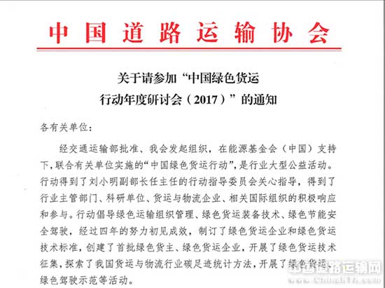 日前,中国道路运输协会发出通知,由中国道路运输协会发起组织,在能源基金会(中国)支持下,联合有关单位实施的“中国绿色货运行动”2017年度研讨会将于11月23日在北京举行。