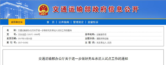 通知还明确了无车承运人试点企业运行的考核标准,其中定量考核部分,试点企业截至2017年12月31日,需同时满足以下条件方为合格:(1)累计上传运单量不低于1万单; (2)累计上传运单天数不低于60天; (3)整合货运车辆数不少于300辆; (4)完成运量不低于2万吨; (5)上传运单平均接入异常率不高于5%。