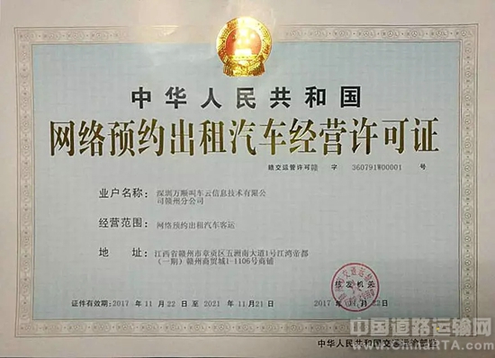 首张《网络预约出租汽车经营许可证》编号为“赣交运管许可赣字360791W00001号”,正面清晰记载着业户名称为深圳万顺叫车云信息技术有限公司赣州分公司,经营范围为网络预约出租汽车客运,证件有效期为2017年11月22日至2021年11月21日。