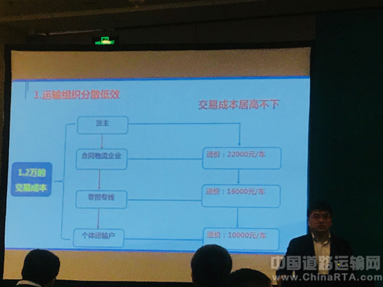 余处长在报告中指出:货运中间环节太多,导致交易成本居高不下,最终反映到全社会就是物流成本过高,我们要降低成本就是要减少中间环节,压缩无效成本,优化运输组织体系进行调整。虽然最终重点是放在单车成本压缩上,但实际上最终成本的压缩是刚性的、非常有限的,司机的燃油、轮胎、通行、人工、维纠等等成本在不断上扬,而且这些客观成本确实存在,压缩空间极为有限,个体运输户在运输成本上的单车运输效率已经达到极致,所以核心应该是压缩整段交易的组织成本,从2.2万元的车货到最终司机到手只有1万元,其中1.2万元被中间阶层“盘剥”掉,这才是降本增效关注的重点。