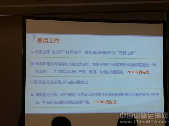 2018年底完成取消4.5吨及以下货运车辆道路运输证和从业资格证、外商投资道路运输业审批立项。